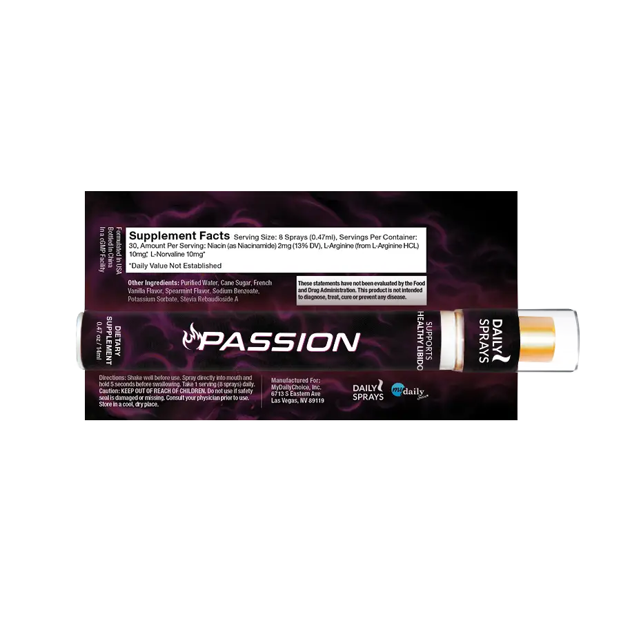 HempWorx & MyDailyChoice Daily Sprays Passion Supplement uses L-Arginine, L-Norvaline and Niacinamide that are included in this potent amino acid combination to boost healthy blood flow and libido. Both men and women’s libidos depend on good circulation and nitric oxide generation, which are supported by L-Arginine HCL and L-Norvaline. PASSION is portable, coming in a compact, handy packaging with a straightforward micronized spray delivery method. Today, try the subtle and simple PASSION Daily Spray. Use with HempWorx Daily Spray 20 Value Pack