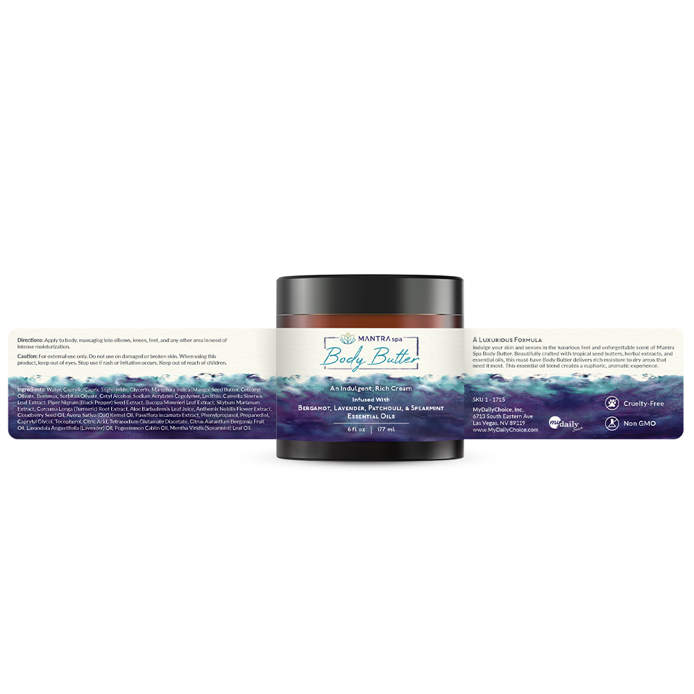 Tropical seed butters, herbal extracts, and essential oils were used in the creation of Mantra Essentials Body Butter to produce a delicious, sensual experience for your skin and all of your senses. With essential oils of Bergamot, Lavender, Patchouli, and Spearmint, this must-have Body Butter provides deep hydration to dry places that need it most.